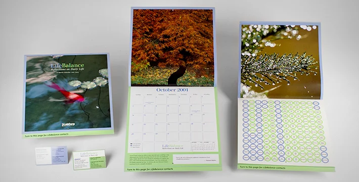 Keeping employees informed of their benefits throughout the year is a continual challenge for the employer. Making it fun and engaging is another matter altogether. Scott’s award-winning design of the LifeBalance Reflections on Daily Life Benefits Program Calendar for LabCorp includes stickers (for important dates to be added on a personal basis), monthly wellness-related reminders, specific plan and human resource information, and various phone numbers and website addresses—all in a visually appealing package.